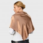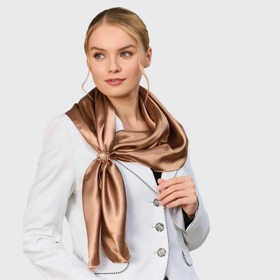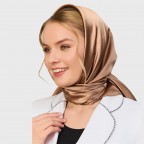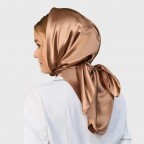 Приваблива жіноча хустка кольору кава з молоком. Оптимальне поєднання лаконічності однотонного полотна з приємною ніжністю тканини. Ця хустинка майстерно поєднується з різними стилями одягу. Може носитися як на шиї, так і на голові. Завдяки неслизькій зворотній стороні вона не сповзає з волосся. Лицьова сторона має приємний глянцевий блиск, який додає нарядності виробу.