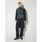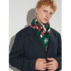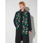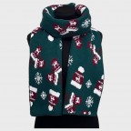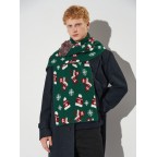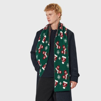 Шарф прикрашений святковим візерунком: багряно-білі шапочки та рукавички на зеленому тлі. Сніжинки різного розміру додають зимового шарму. Такий аксесуар створює чудовий настрій і робить ваш образ виразним.