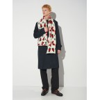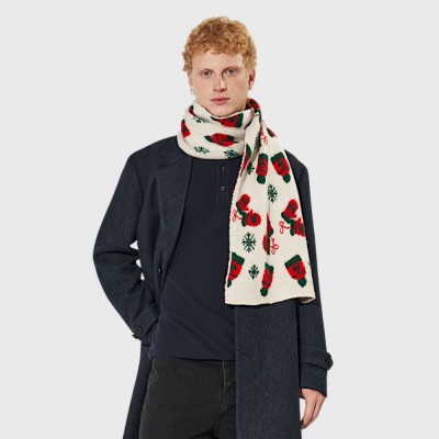 Додайте у свій гардероб трішки свята з теплим шарфом молочного кольору розміром 180×35 см. На полотні виконаний яскравий новорічний малюнок: червоні рукавички, шапочки Санти та зелені сніжинки створюють справжній зимовий настрій і миттєво переносять у атмосферу Різдва.