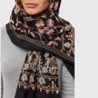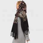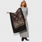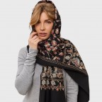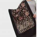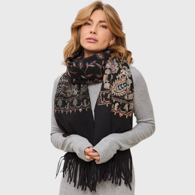 Привабливий та завжди трендовий шарф з квітковою вишивкою. На кашеміровому полотні кольору глибокої ночі розквітли, мов у місячному світлі, плавні лінії завитків східного візерунку. Орнамент пейслі чергується з ніжною садовою композицією, що підкреслює ласкаву жіночність пропонованої моделі. Оксамитове тепло, яке дарує палантин, створює почуття затишку та комфорту. Акуратне виконання обох сторін - без вузлів та зачіпок. Тонкі китиці (+10 см з кожного краю) візуально подовжують образ, додайють граційної легкості аксесуару.