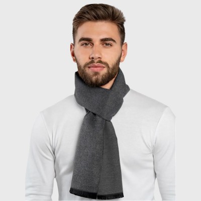 Стильный мужской шарф в классическом сером цвете. Нейтральность цвета и деловая стилистика позволяет носить аксессуар под классическое и кэжуал направление в одежде.