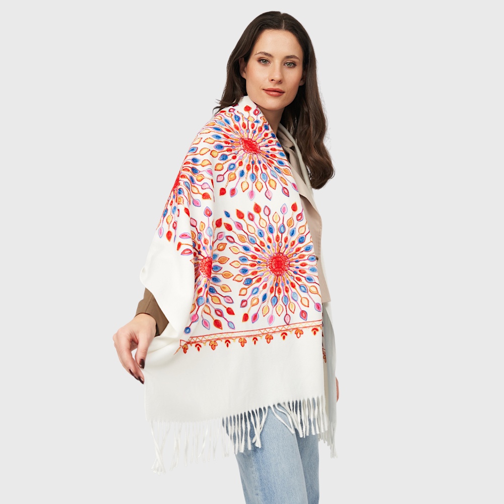 Белый шарф кашемировый с вышивкой солнце 180*70см