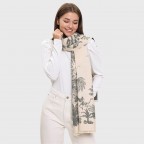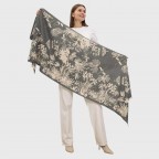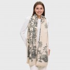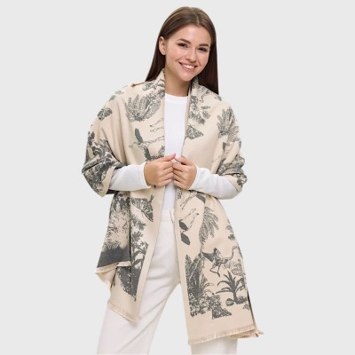 Эффектный теплый женский шарф с тропическим растительным принтом. Небанальное дизайнерское изделие точно порадует всех, кто ищет практическую вещь не за все деньги мира. Этот шарф действительно прекрасно согревает, он умеет держать тепло и дарить ласковые объятия. У него два характера – молочно-бежевый и угольно-серый, сочетание которых создает поистине великолепный ансамбль. Кстати, это дает больше простора для фантазии – как носить и с чем совмещать изделие. Полотно нежное, очень приятное на ощупь, без ворса. Такой аксессуар послужит роскошным подарком к праздникам!