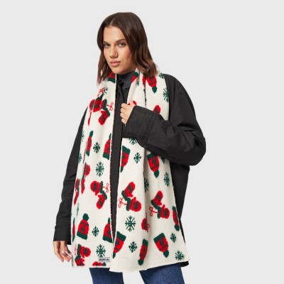 Добавьте в свой гардероб немного праздника с теплым шарфом молочного цвета размером 180×35 см. На полотне выполнен яркий новогодний рисунок: красные перчатки, шапочки Санты и зеленые снежинки создают настоящее зимнее настроение и мгновенно переносят в атмосферу Рождества.