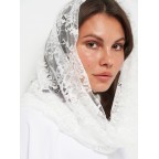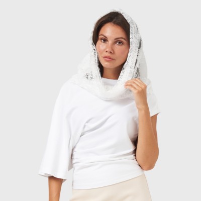 Красива хустка-снуд білого кольору. Ідеальний аксесуар для церкви. Із ним ваш візит до храму відповідатиме усім правилам: покрита голова, прикрита шия та плечі. До речі, тканина не слизька - хустина не спадатиме з волосся, тож ви не відволікатиметесь від молитви. Вишуканий мереживний візерунок вдало пасуватиме до церковного одягу. Виріб абсолютно легкий та компактний - не займе місця у клатчі або у сумочці. Хустинка дуже ніжна і потребує ручного прання.