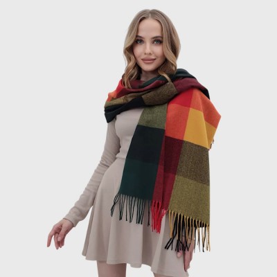 Пошуки картатого кольорового шарфа можна вважати офіційно завершеними - ви натрапили на саме ту модель, яка стане окрасою вашого вбрання! Виграшний акцент - поєднання доволі крупних квадратів жовтого, червоного, зеленого кольорів, але без отруйної кислотності. Усі відтінки теплі, лагідні, м'які, як і полотно пропонованої моделі. До речі, розміру буде цілком достатньо, аби носити і на плечах, і обв'язати навколо шиї декілька разів.