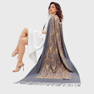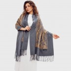 • Жіночий кашеміровий шарф сірий з золотим індійським орнаментом 180х70 см