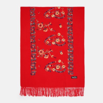 Розкішний червоний шарф-палантин з кашеміру. Дивовижно м'який та теплий аксесуар, який припаде до смаку усім поціновувачкам небанальних речей. Полотно легке та дуже приємне на дотик. Попри велкикий розмір, шаль не громіздка, зручна у використанні. Комфортно носиться як накидка, а також у зібраному вигляді. Вишивка заворожує майстерністю. Дуже якісно виконана. Зворотній бік - взагалі ідеальний, без зачіпок. Приємний контраст кольорів дозволяє експериментувати з одягом та способами носіння.
