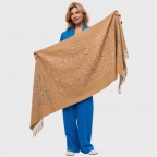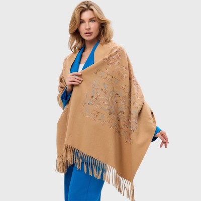 Теплий вишуканий палантин з етнічними мотивами – це аксесуар, що поєднує традицію та сучасність. На карамельно-золотистому фоні розквітає чарівний сад квіткової вишивки. Майстерне поєднання рослинних і етнічних орнаментів створює неповторне враження.